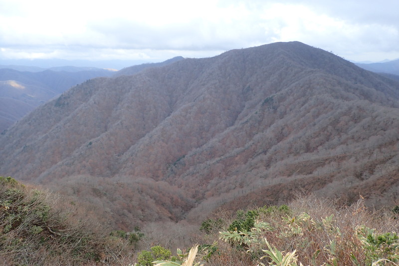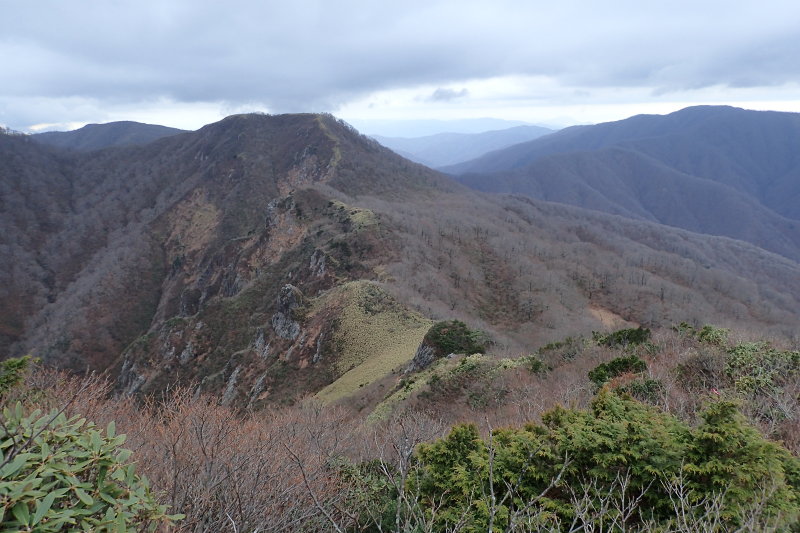 ササの背の低いところでは胸のすくような展望が得られる縦走路だ。見渡す山並みはすべて葉を落としたブ
