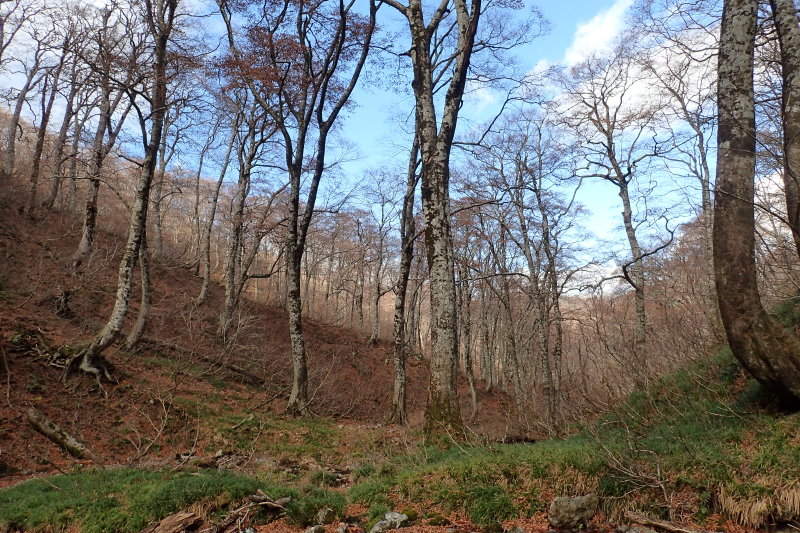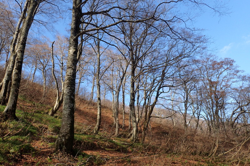 ここから登山口までは1時間ばかり。ブナの尾根と美しい谷を楽しみながら、のんびり下ろう。