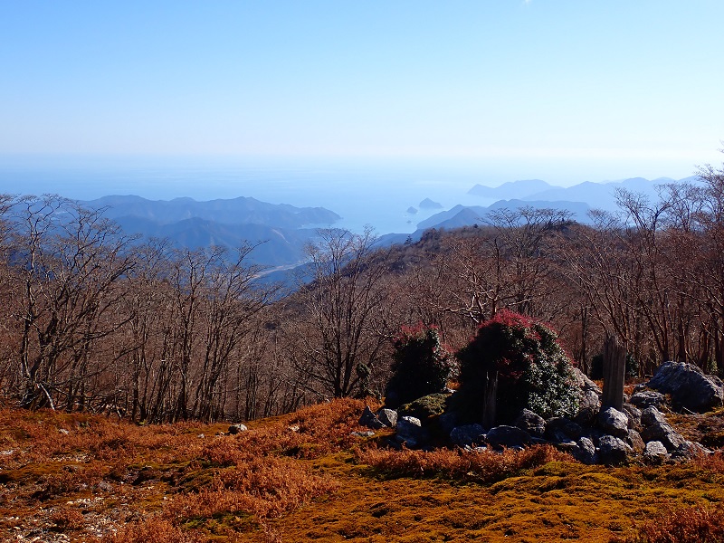 登り返し、滝口に降りて対岸の尾根に乗る。この道は気持ちのいい道で、展望がいい。東側は切れ落ちているので、引本浦が木々の間から望める明るい尾根だ。そのわりに、危うさを感じることなくしっかりとした道がつながっている。尾根が広がりだすと獣道が縦横無尽に走り出す。P871に着くと、小木森谷の木馬道の終点からつながる道に合流する。対岸の花抜山の標高を越えるとすぐに八町尾根に乗る。ここには山マークの標柱がある。山マークは小木森谷側に向いており反対側に番号が記されている。民地側に山マーク、国有林側に番号が記されているので、八町尾根の小木森谷側は尾鷲の土井家の所有ということだ。上っていくと木馬道跡の溝道が出てくる。