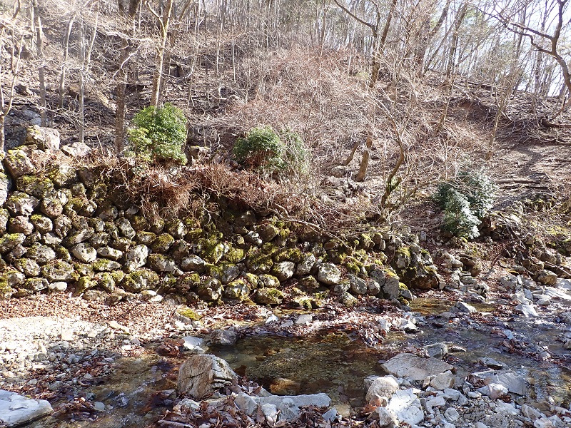 これに沿って下っていくと六線索道跡に着く。強固な石垣に守られた平地にレンガやわずかな生活痕が残っている。右俣にはいくつも溝道があり、木馬道跡のようで木材搬出でにぎわった残り香が感じられる。