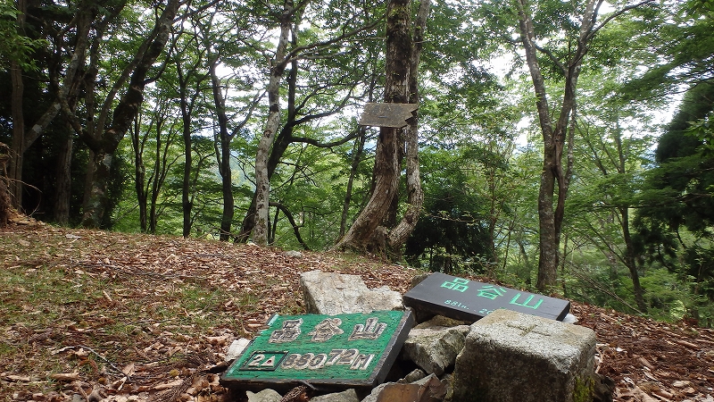 品谷山は樹木に囲まれたのっぺりとした台地の真ん中広場に三角点柱があった。峠から1時間半かかったが、市販マップと同じくらいなので上出来としよう。