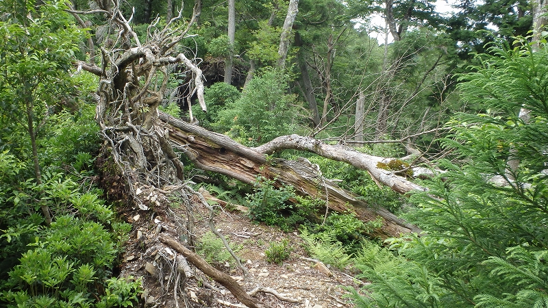 途中から崩壊箇所や倒木で何度か小さなルートロスを繰り返し、ルーファイに悩みながらの下降。トラブルで尾根芯が通れなくても、常に尾根を見据えながら進めば踏み跡に復帰できる。