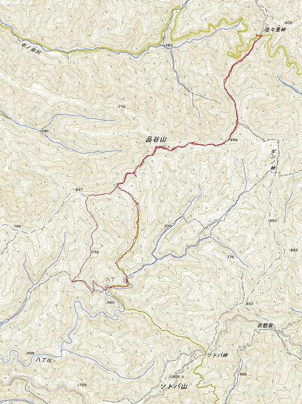 標高735mの佐々里峠からが一番高低差が少なく、今の自分にとってハードルが低そうだ。ルート上の最高点は△880.7品谷山。最低部の廃村八丁はco650m辺りなので、差は200m余りしかない。