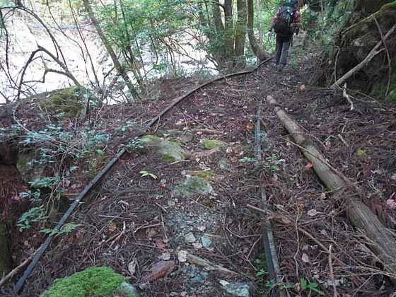 林道に沿ってトロ道は進み林道の傾斜がきつくなりかけたあたりでガレ場を下りる。大きな岩が重なった下にトロッコレールを発見。川床にも落ちている。このあたりはレールは残っていたものの山抜けで土砂に埋もれるか流された感じだが、トロ道に間違いない。しばらくするとグーさんが発見した小尾根を巻く軌道が残っている場所に着く。ここからはトロ道はしっかり残っており山道として歩ける状態になる。