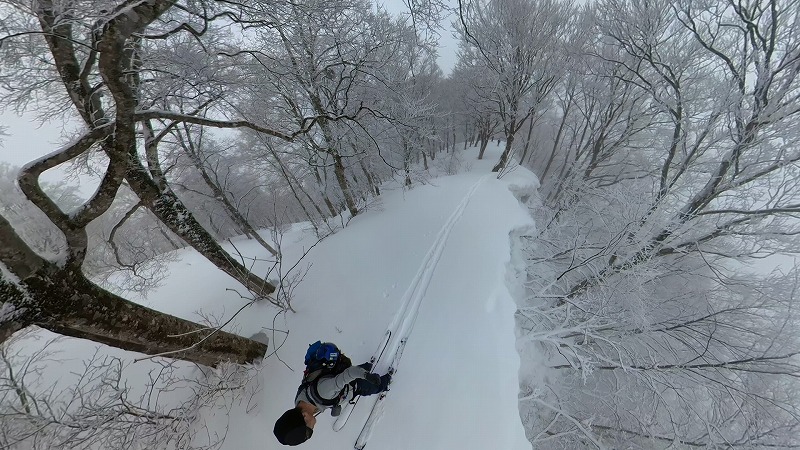 登りの状況でおわかりの通り、雪庇が左右に出ているヤセ尾根の滑走