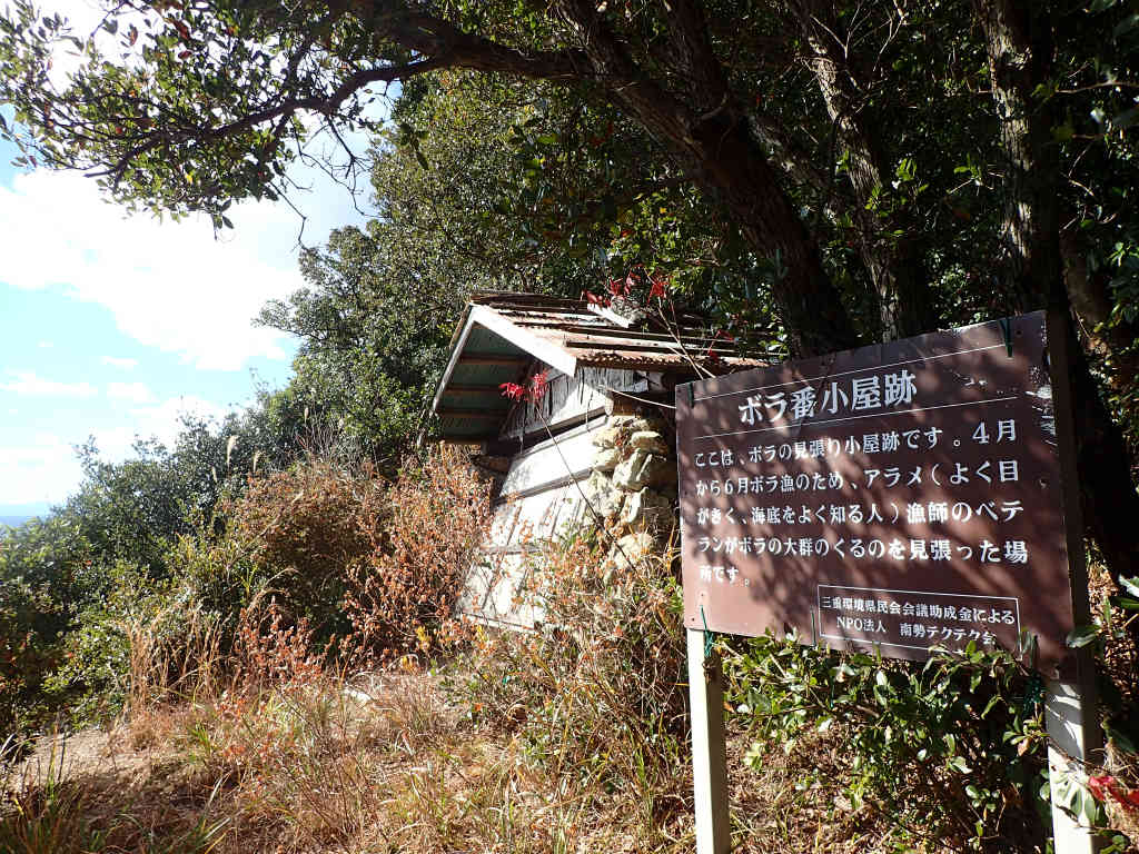 田曽浦の堤防の端から三崎さんのほうへ登り返し,途中のボラ番小屋で昼食の予定。しかしボタ番小屋に来てその荒れようにびっくり。初めて来た10年前は,海を眺めながら焼肉とビールで腹を満たし,ついでに昼寝もできたのだが,今回来てみると灌木が成長し,しかも小屋前の土が崩れて斜面になっている。みんなで顔をつき合わせて昼食と思っていたのだが,2カ所に別れることになり,残念。この場所もだんだん崩れていくのだろう。