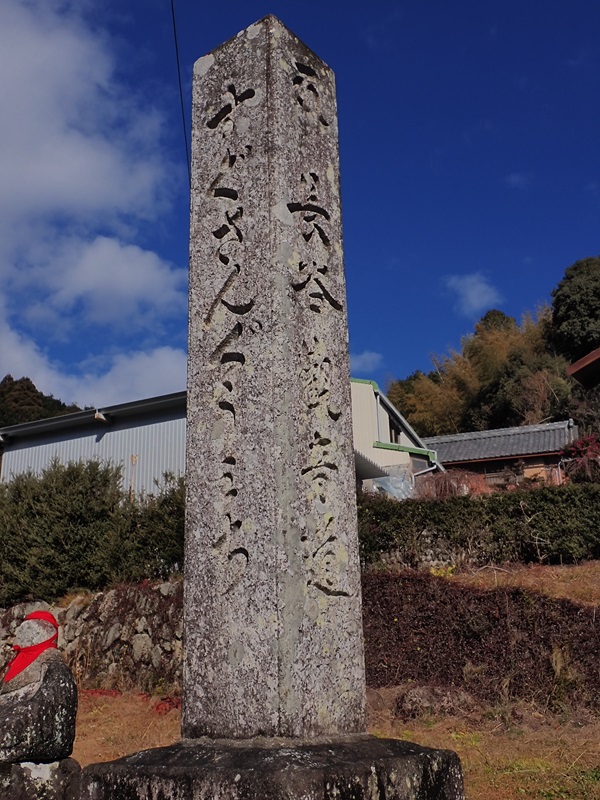 境内の北端の石柱を越え三疋田林道への分岐には仏像が上部に掘られた道標があった。