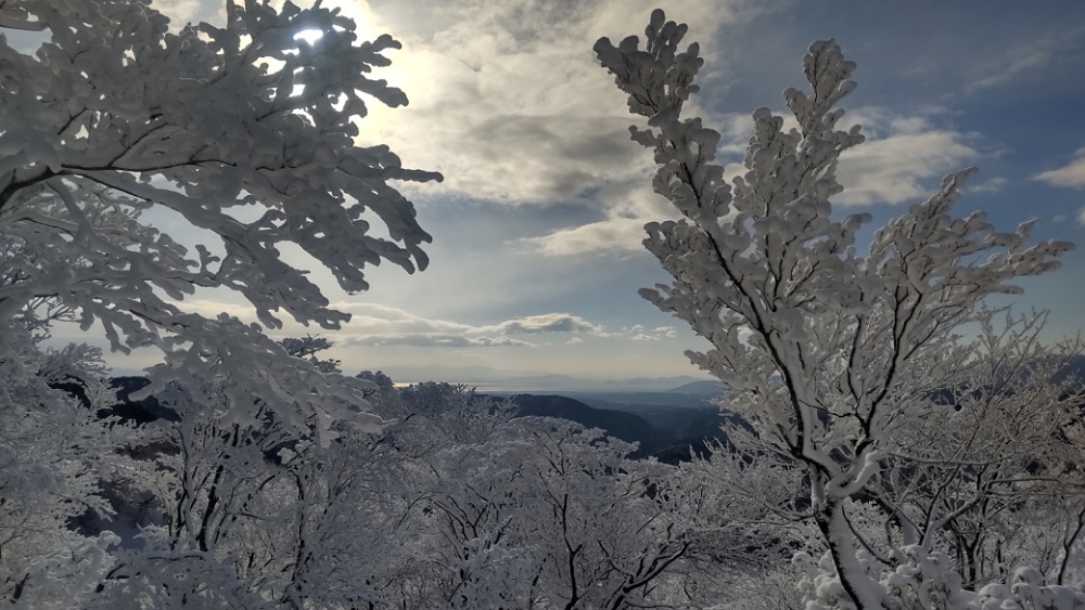 降り積もった雪でさらにやわらかに広がり、東側の霧氷に飾られた木々の向こうに覗くびわ湖は青磁色の宝石のように輝いている。