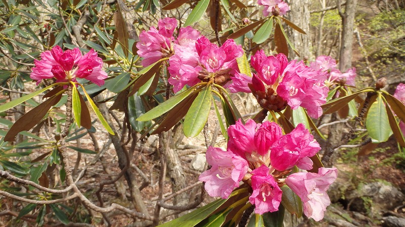 山中で出会った花はシャクナゲ、コバノミツバツツジ、アセビなどの樹花、足元のイワカガミ、タチツボスミレ、ハルジオンくらい。シロヤシオは見当たらない(まだ早いのか?)。