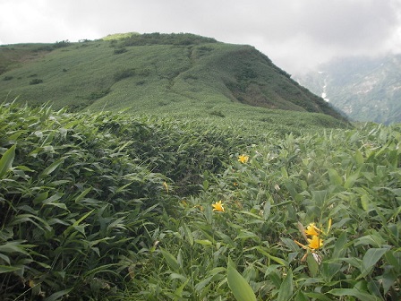 三ノ峰からコルに下り登り返すと別山平に出ました。一面を埋め尽くすニッコウキスゲもガスが晴れず霞んでいます。