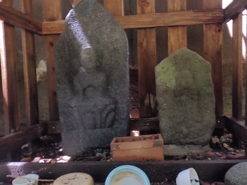 峠から嬉野小原に下り中村川沿いに上っていくと石積の上に自然石の石仏が置かれている。「大日」と書かれており大日如来の石仏だ。小原の下流部にも灯篭や石仏、祠、五輪塔などが集められている所がある。明治の廃仏毀釈の際に集めたようだが、ここにも大日の石仏に阿修羅を納めた石祠があった。