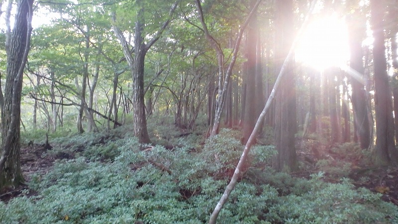 八幡工高と名大の小屋はまだ健在だ。その裏から迷い尾根に取り付く。この尾根は登ったことがあると思うのだが記憶は全くない。登山路というには貧弱な踏み跡を探しながら少しして「レスキューポイント1」の黄色いプレート。ここが「1」なら最後は何番やろ? 朝の陽光が木漏れ日となって降りかかる。まるでスポットライトを浴びている気分。上空は白っぽいがどうやら予報通り晴れてくれそうだ。やっとこさで尾根に登りついたら「RP2」のプレート。 co820ⅿあたりだ。さらに15分でその先の・845らしいピークに到着。ここが県境尾根とのjctかと思い込んでいたせいでGPSの指針と合わない。少し迷ったがGPSに従って下り気味に進むと正しいjctピークに出て、「ここは迷尾根」のプレートが立つ。隣には「RP3」プレートも。