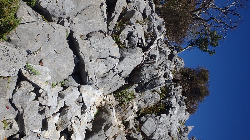 ここからも山腹の巻き道を行く。co1050mからはカレンフェルトの岩ゴロゴロ急斜面。イヤな巻き道より登りやすいかも知れない。頂点に「昭33 9」と彫られたセメント会社の石柱が立つ。ここが「展望丘」かと思ったが、その先のピークに登山者の姿が見える。「プチ展望丘」ってことにしてホンモノへ疲れた足を運ぶ。 さすがに人気の藤原岳だ。平日というのに展望丘には登山者が数人。若い女性ペア、単独の妙齢女性、岩の上では高齢男性が昼寝中。そのうち別の単独男性も登ってきた。見下ろす小屋のあたりにも人影が幾つか動いている。少し離れた天狗岩にも登山者の姿が見える。晴天予報は今日一日だけということもあるのだろう。