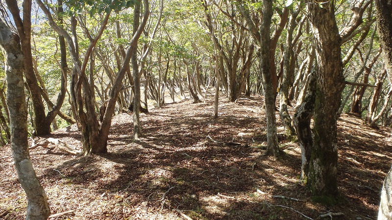 ここから藤原岳までの標高差は300ⅿくらいだから正午までには着けるだろう。気持ち良い尾根を進み孫太尾根の・965pが近づく。ピークには行かず左のトラバース道へ。地形図の2本の破線のうち上のほうを進む。道と言ってもヤブはないが踏み跡程度の獣道並みだ。