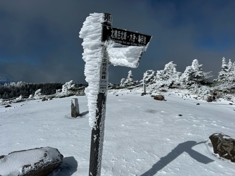 山名板に張り付いたエビのしっぽや樹氷、まるでまるで厳冬期のようだ。 来て良かったと思える瞬間である、雪を被った赤岳や阿弥陀岳の南八ヶ岳も確認出来る、