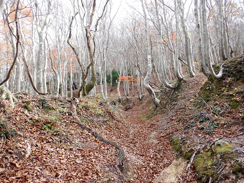 峠が近づくと一面ブナ林に。葉を落としたブナ林もうつくしいですね。太さを見ると戦後に皆伐されたあとの二次林でしょうがなぜほぼブナの純林になったのでしょうか?