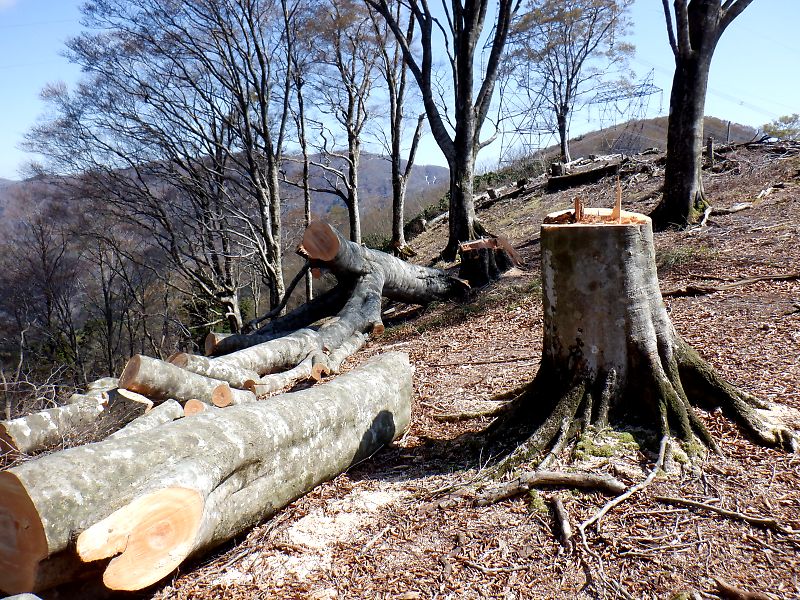 この周辺は、トチ、ケヤキ、ブナの巨木の森。この森が人間の手によって壊されないよう願うばかりです。グーは送電鉄塔の建て替えのために大日のブナの大木が軒並み倒された現場に出くわしました。