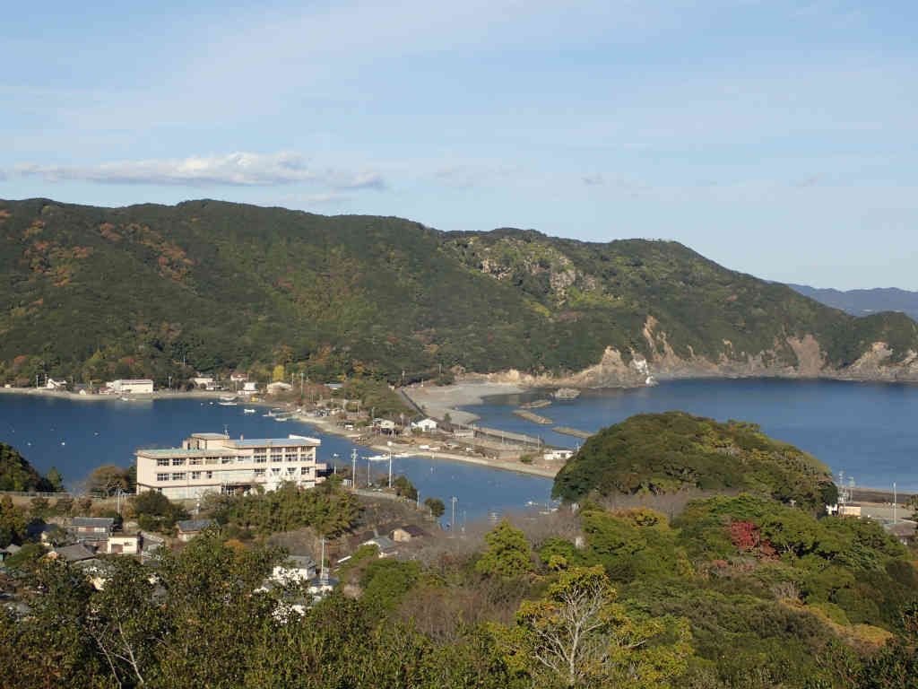 相賀漁港を通ると、朝の漁が終わったのだろうか、漁師の人たちが網の手入れをしている。細いメイン道路である郵便局前を通り過ぎ、左手のコンクリート階段を登ると小尾根である。標高140m付近まで登ると、米子浜への見晴らしのいい分岐。西にはこれから向かう米子浜とその右に局ヶ頂のいただき、東は相賀漁港と、その向こうに三崎の突端、さらにその向こうに浜島と志摩半島が綺麗に見えている。