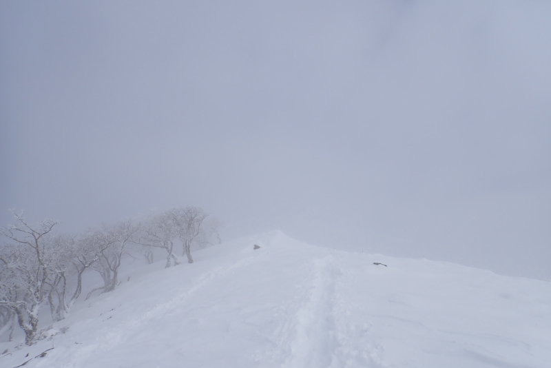 この日は、晴れの予報でしたが山中は霧。笹峠は結構な雪が積もっていましたね。西南尾根は、新雪のラッセルでしんどかった記憶が強く残っているのですが、