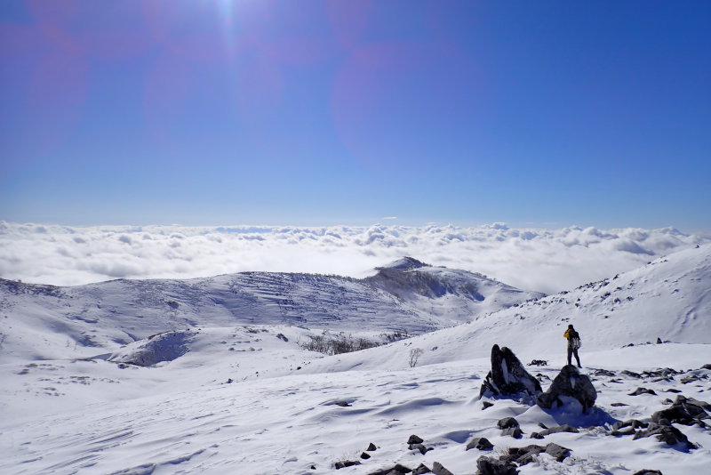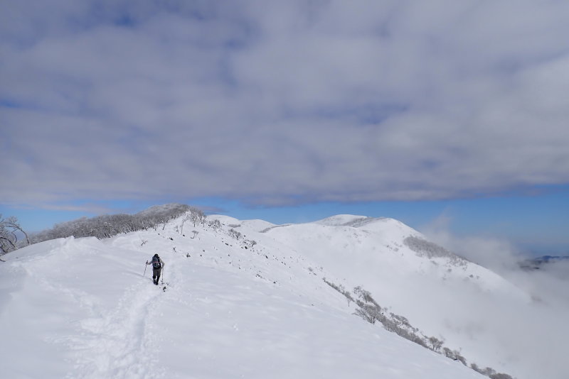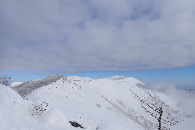 >三角点へのゆったりとした雪原が広がる尾根と、南西尾根との間に緩やかに上がってきた大洞谷の源頭が作り出すたおやかな地形は、ずっと見ていても飽きることがない。なにか日本離れした風景を感じる。他では見られることのない異次元ワールドですね。これからも冬の登山者が増えるかもしれません。