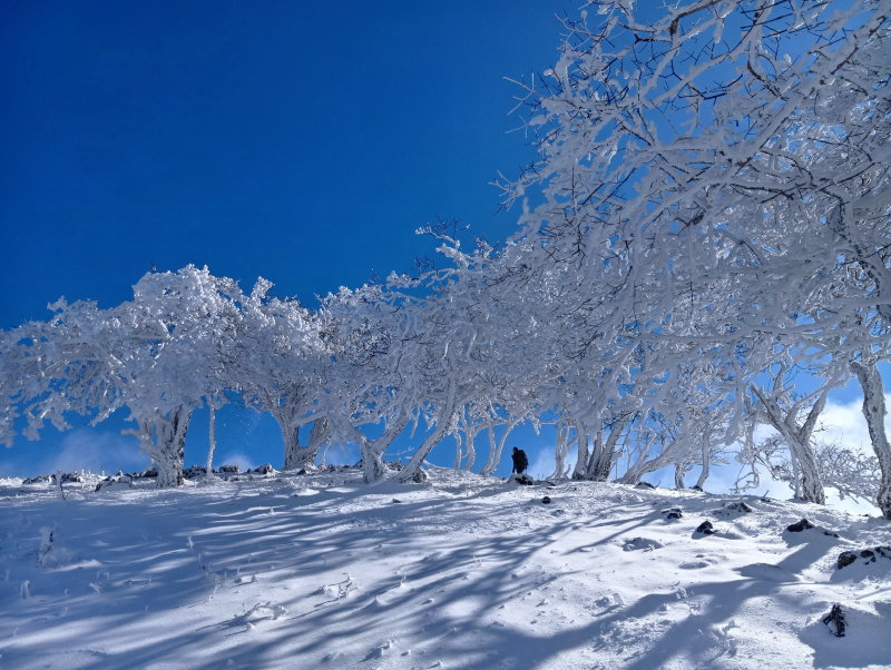 最高点の手前からは頭上には一気に青空が広がった。霧氷には青空がよく似合う。