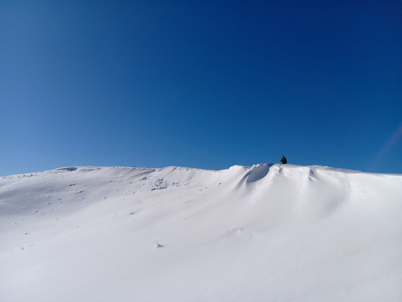 遅めに出発して正解でした。たおやかに広がるまっ白な稜線と、透き通った青い空と、たなびく白い雲が織りなす夢のような世界に出会えました。