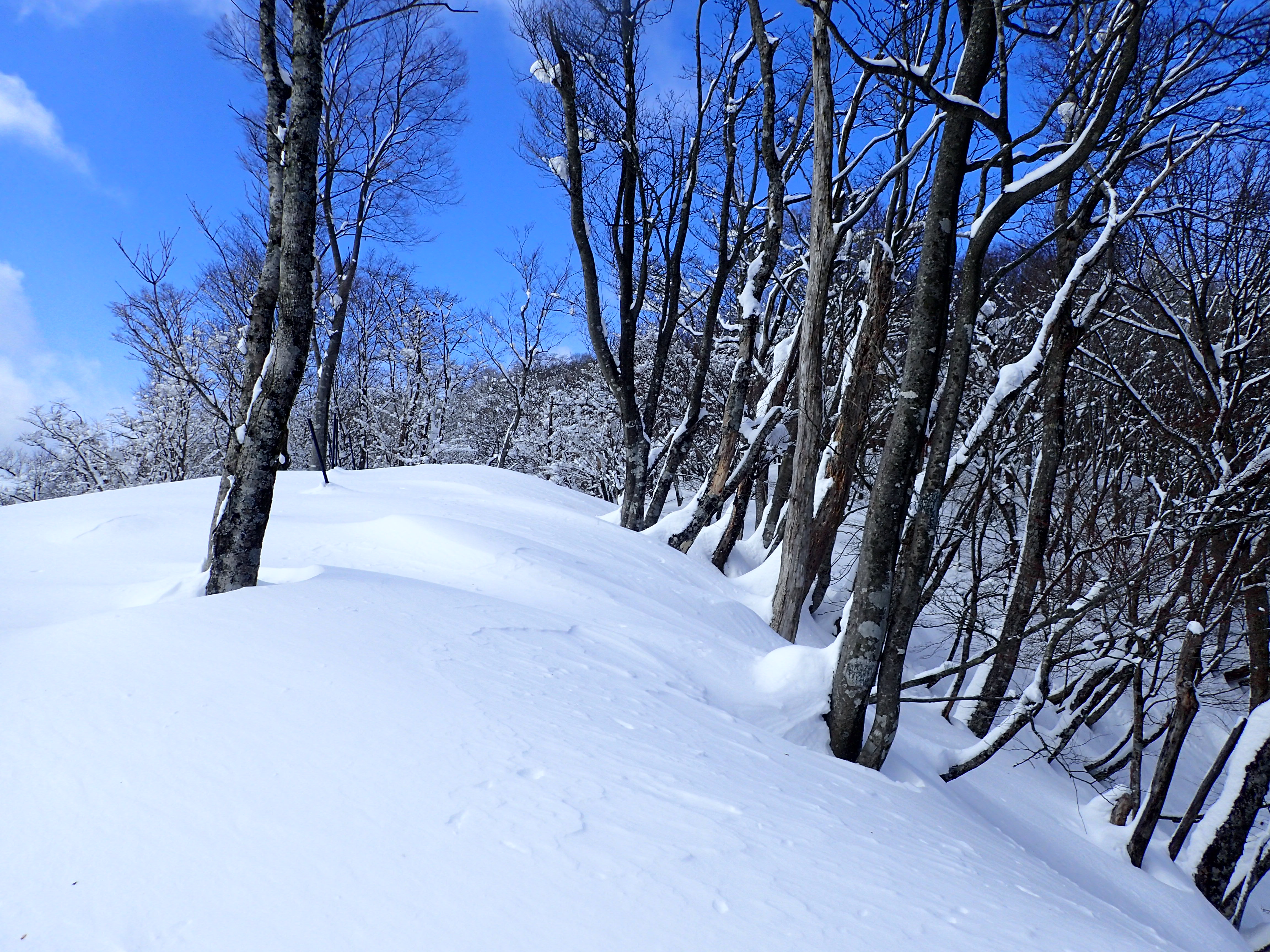 急登が終わると、急に風が強くなった。地吹雪が起こるほどである。その上、陥没にも悩まされ、思ったよりも時間がかかった。
