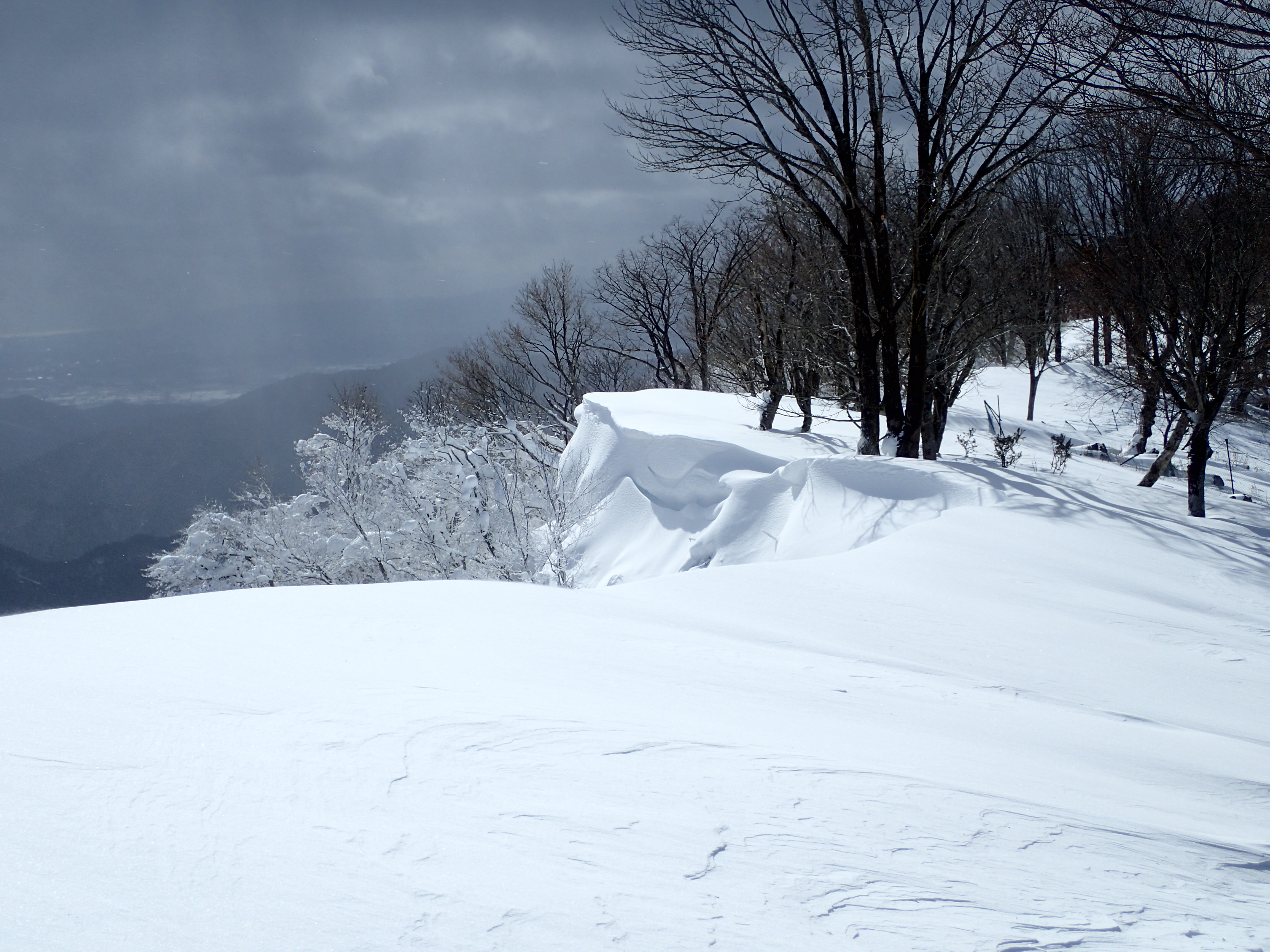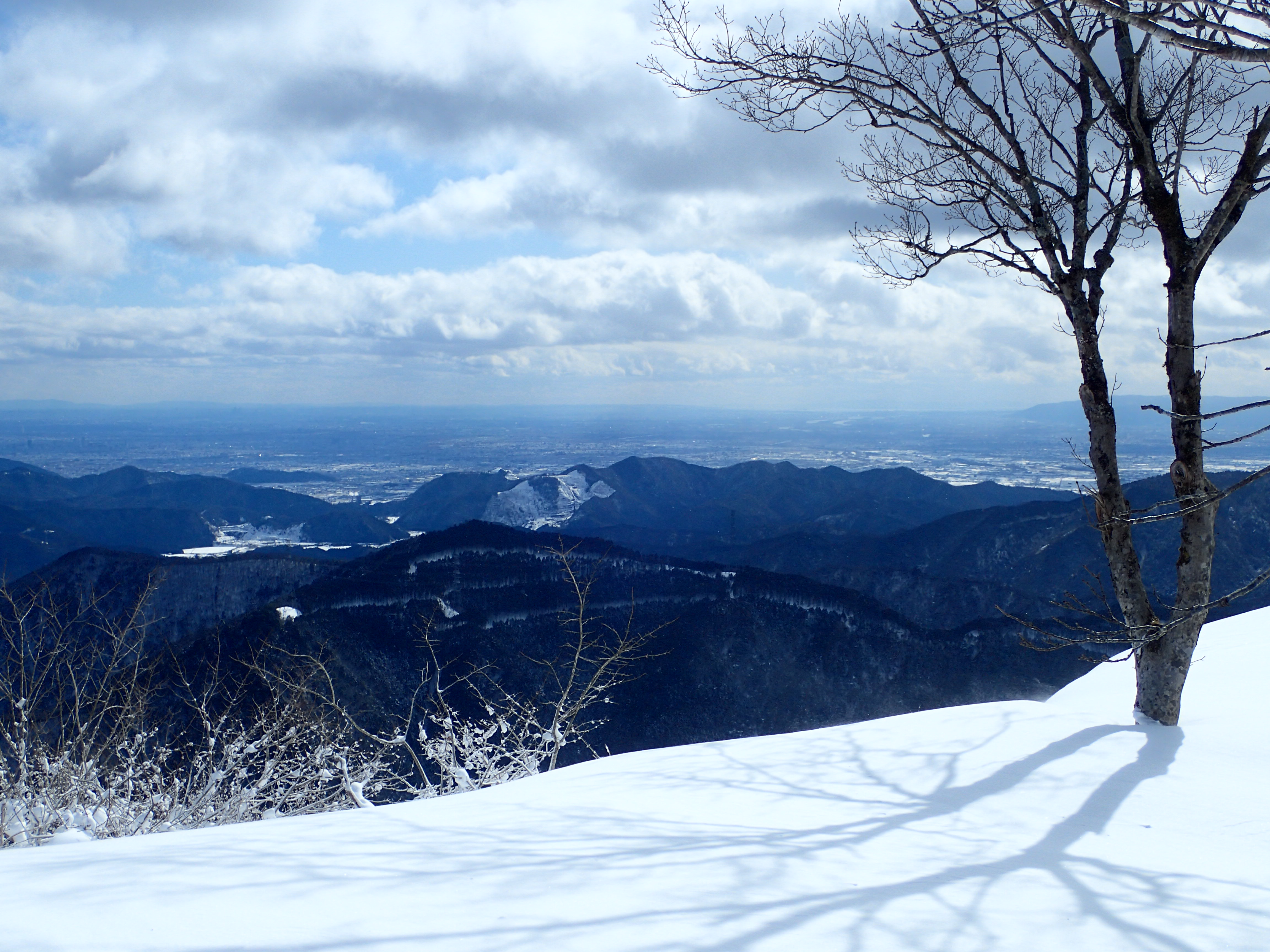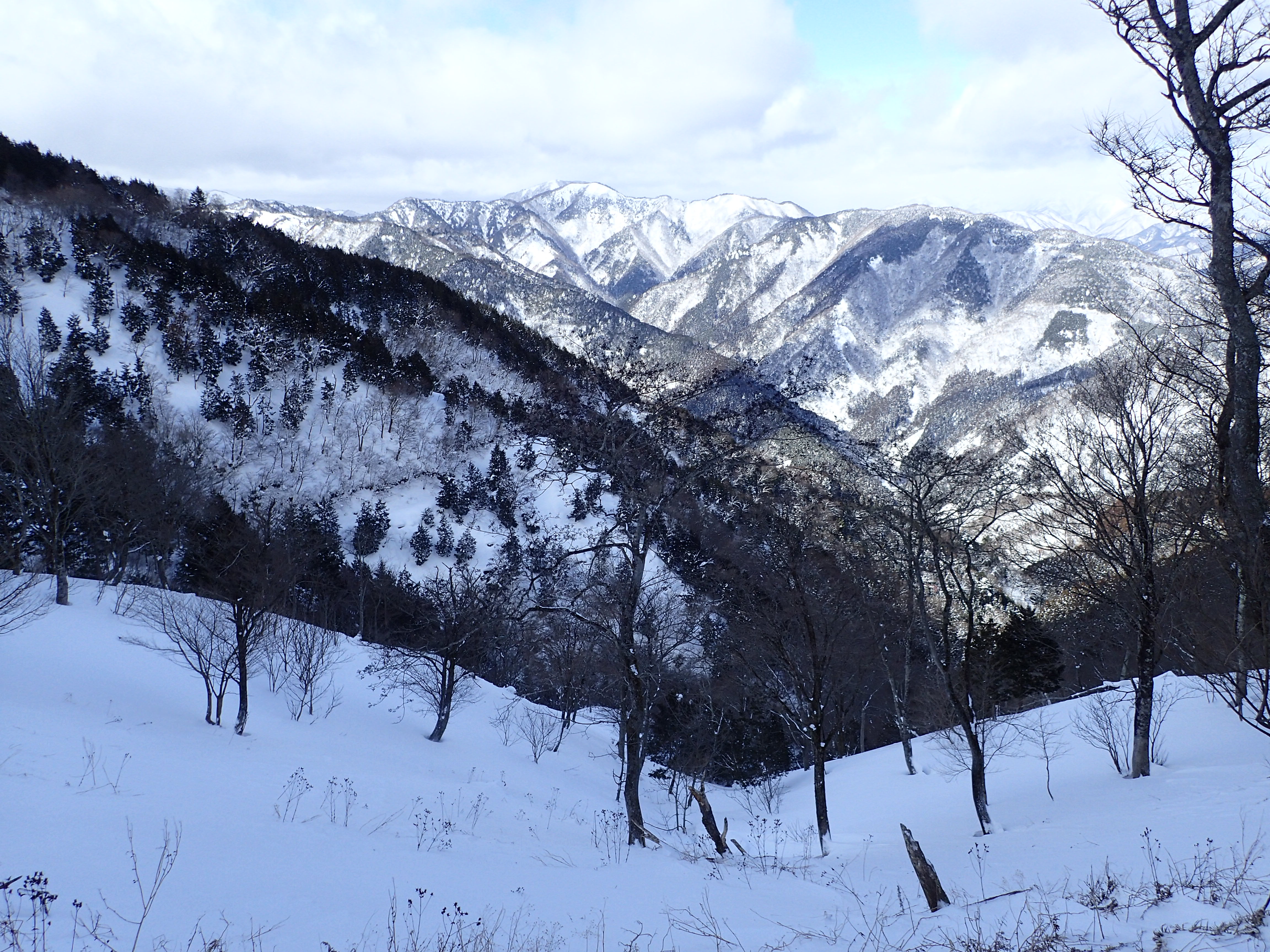 展望が開けるポイントはいくつもあって、なかなかいい山である。しかし、登頂できたら12時を過ぎていて、高尾山(931.6m)まで縦走する計画を断念して引き返すこととした。戻る時にはトレースは消えかかっていた。