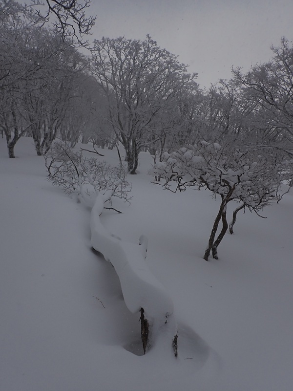 御池岳は見る影もなく、強風吹きすさぶ頭陀ノ頭から逃げるように尾根筋を下ると風は止む。このあたりは真の谷から上がってきているナガレボラの源頭で、稜線は広い谷を巻いており、テーブルランドの始まりだ。源頭に下る雪原や天狗岩方面の藤原岳に霧氷の森が広がる水墨画の世界だ。人が歩いていない新雪の藤原岳のテーブルランドは貴重で、ノートレスは2度しかない。青空は望めないが軌跡を残しつつ丘を乗り越えていく雪の重みが心地いい。雪がしまっている訳ではないので場所によっては落とし穴のように沈み、何度かつかまった。