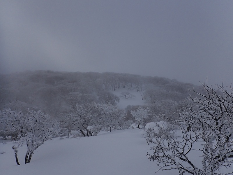 人が歩いていない新雪の藤原岳のテーブルランドは貴重で、ノートレスは2度しかない。青空は望めないが軌跡を残しつつ丘を乗り越えていく雪の重みが心地いい。雪がしまっている訳ではないので場所によっては落とし穴のように沈み、何度かつかまった。