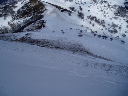 北斜面を滑降しますが、笹が頭をだしているところは右端から巻きおります。山頂から付いているシュプールは鈴鹿スキモさんが残したものでしょう。国内外の山スキーレースで活躍するアスリートの同氏の残したシュプールは滑らかで見事でしたが、素人同然の私にはその跡を追うことはできません。