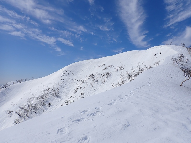 東雨乞の最後の上りはクマザサが深く中途半端な雪だと落とし穴地帯になってしまうが、大丈夫で、雪原についた縦じまのシュカブラとウロコ雲が絶妙な景色を織りなしていた。