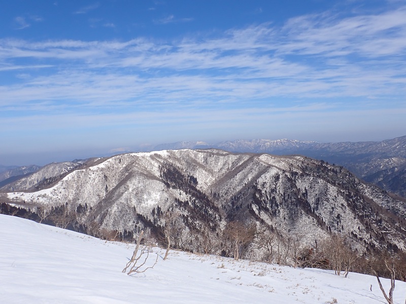 コクイ谷分岐手前で石と倒木を使って渡渉し、対岸の尾根に取りつき七人山東峰の北東尾根をスノーシューで上るが雪尾根は思ったよりも狭く感じた。七人山雪原を歩き七人山に近づくと青空を背景に東雨乞のドームの壁が迫ってくる。コルに下ると深い大きな溝道が出てくるが雪の厚みでいつものような迫力がない。天気も良く展望も抜群で、東雨乞上部のハゲからは、正面にイブネ台地が横たわり、根の平方面には尾根を広げた釈迦ヶ岳が見える。七人山の奥に御在所岳、鎌ヶ岳はきれいに見えるが、暖かく空気が澄み切っていないので津の造船所のドックは見えなかった。東雨乞の最後の上りはクマザサが深く中途半端な雪だと落とし穴地帯になってしまうが、大丈夫で、雪原についた縦じまのシュカブラとウロコ雲が絶妙な景色を織りなしていた。
