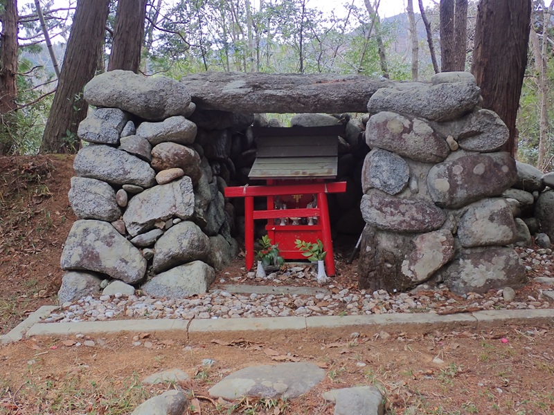 登山口を少し上ると鳥居の奥に金毘羅さんがある。海上交通の守り神として信仰されてきた金毘羅権現だが、出江が櫛田川水運の要衝であったことから祀られたのだろう。祠横には自然石が二つ置かれ、山の神のようだ。尾根道は自然林で明るく様々な木が生えている、田園を見渡せる稜線のナワシログミの木が印象的で、苗代を作る時期に実がなる。ひと上りで平坦な南砦で田古加山と呼ばれ、高野山で枝を束ねてほうきにしたコウヤボウキが茂っていた。