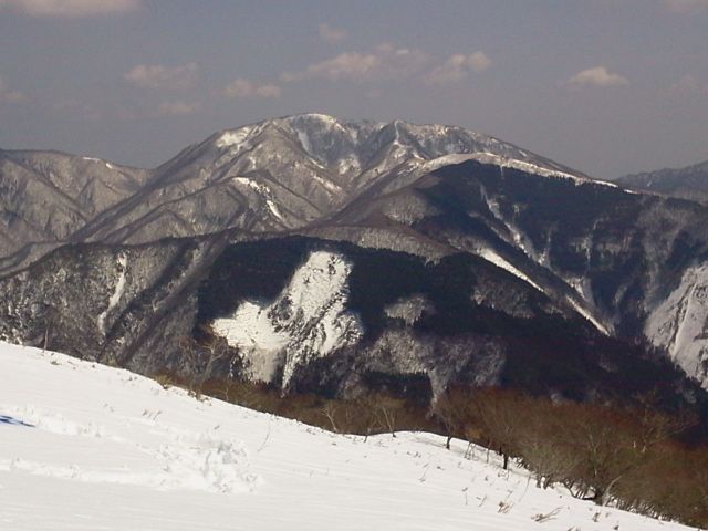 きつい尾根を登りきって綿向山頂に出ると10人ほどの登山者が好天のもと昼食の最中。ここは雨乞岳はもちろん鈴鹿山脈の全景をを眺めるのに絶好の展望台だ。