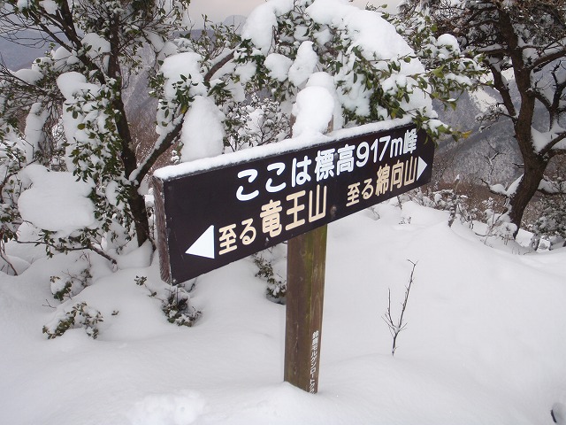 13時56分、平坦な稜線の途中に竜王山の標識があった。回りの木は少し伐採されて展望が確保されている。山頂付近の伐採に異論を唱える向きもあるが、この程度なら許されるだろう。それにしても長かった。雪が無くてゆっくり綿向山を下ってきたら2時間はかかっていただろう。