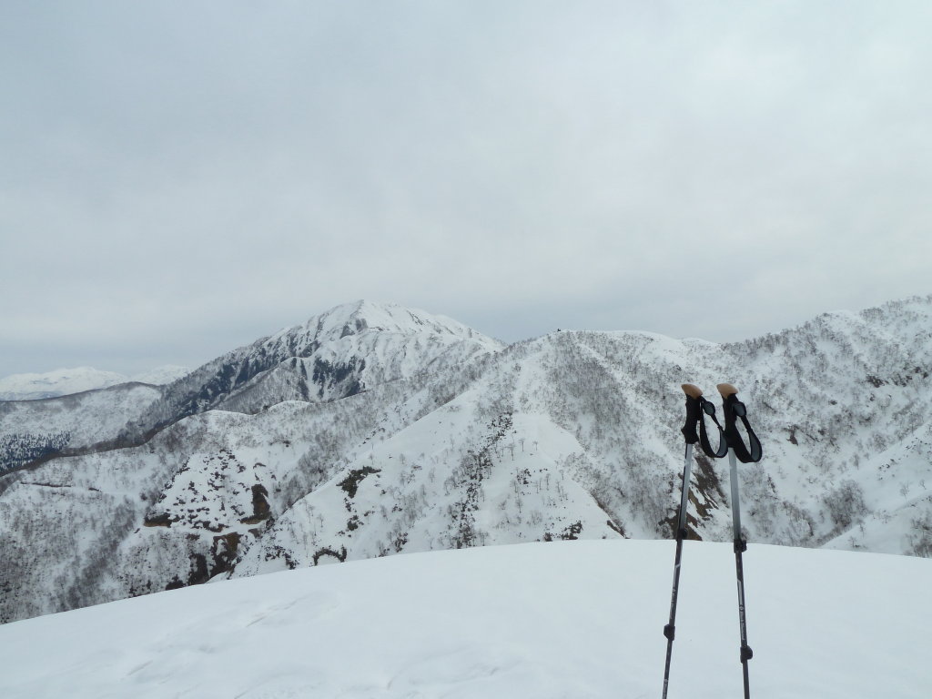 クラストした急斜面を登山靴のエッジを利かせて上がれば持篭谷山頂だ。風が強く寒いのでアウターを着込んだ。
