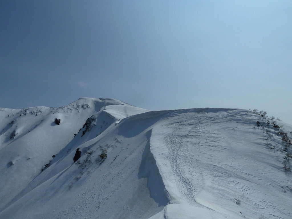 ひと汗かいて尾根に乗れば後は広い雪尾根を辿るだけである。雪は完璧に締まって、ビブラムの跡がわずかに