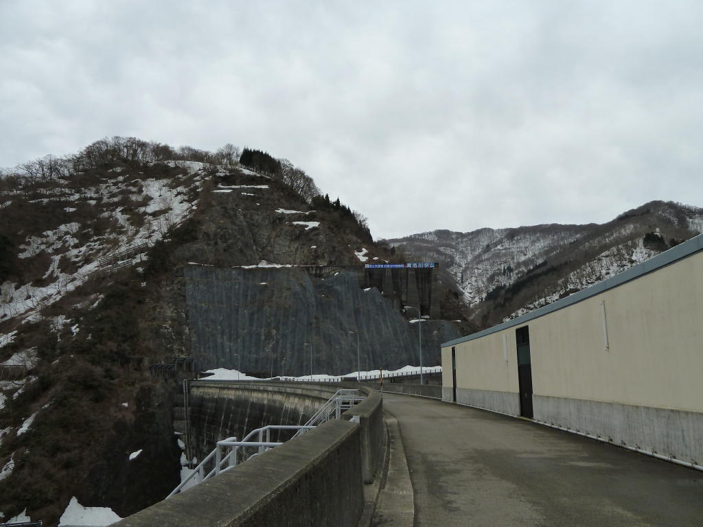 真名川ダム湖の水面は曇り空を映して鈍く光っていた。下流方向の高みには真っ白な三角がわずかに頭を出し