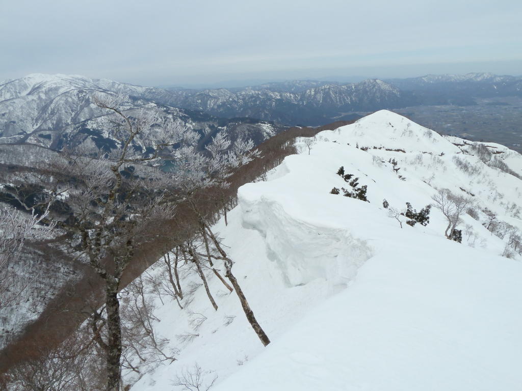 膨大な積雪が形作る雪堤も、そろそろ本来の尾根芯と仮想尾根の境界あたりに割れ目が入り始めて、迂闊に足を