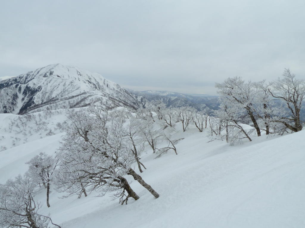 1209mJPに向けて白い雪稜がうねっている。右の持篭谷側はブナ林が続く。左側の見晴らしがやたらいいのは