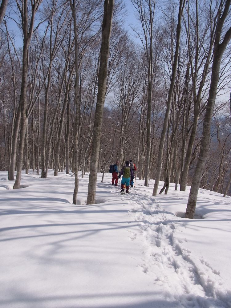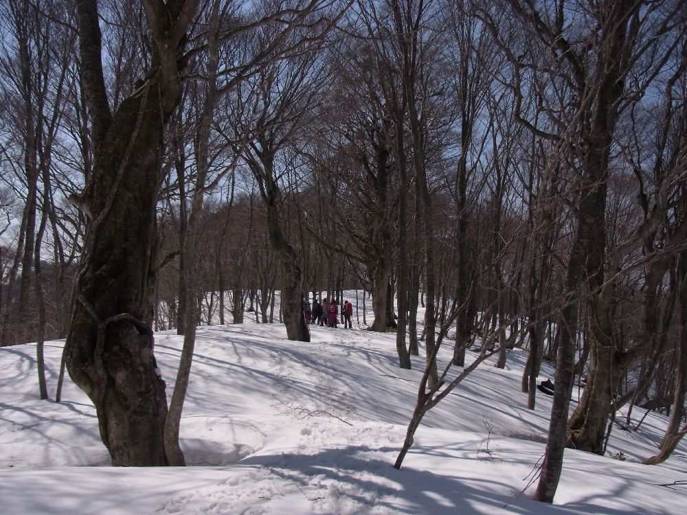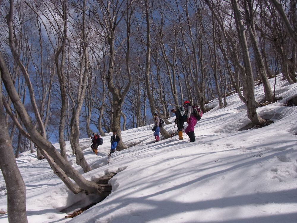 尾根直下のブナ林からはやっと雪の斜面になりホッとしました。