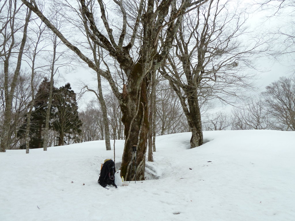 初めて訪れた雪の谷山は広々とした雪原にブナ等の木が疎らに生える美しい所でした。スコップでテーブルをつくり、雪山歩きを始めたばかりの仲間とのんびりと昼食をとりました。