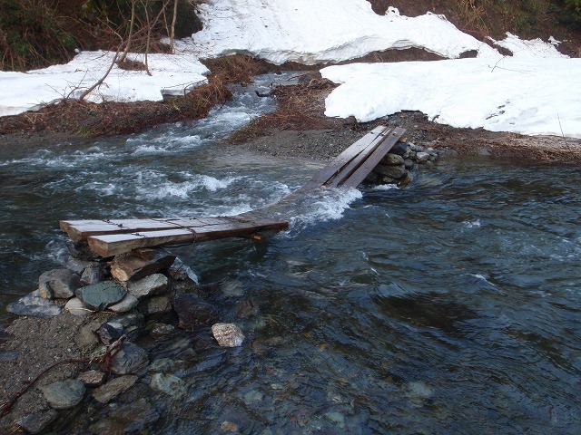 でも、見れば先週より川の水量が多い。昨日は雨だったし、気温も上がって雪解け水が増えているのだろう。橋の真ん中の水流部分は幅1mちょっとくらいだ。おずおずと足を掛けようとしてストップ! なんと水没していない部分が凍ってツルツルなのだ。これじゃあ渡るのはとても無理。