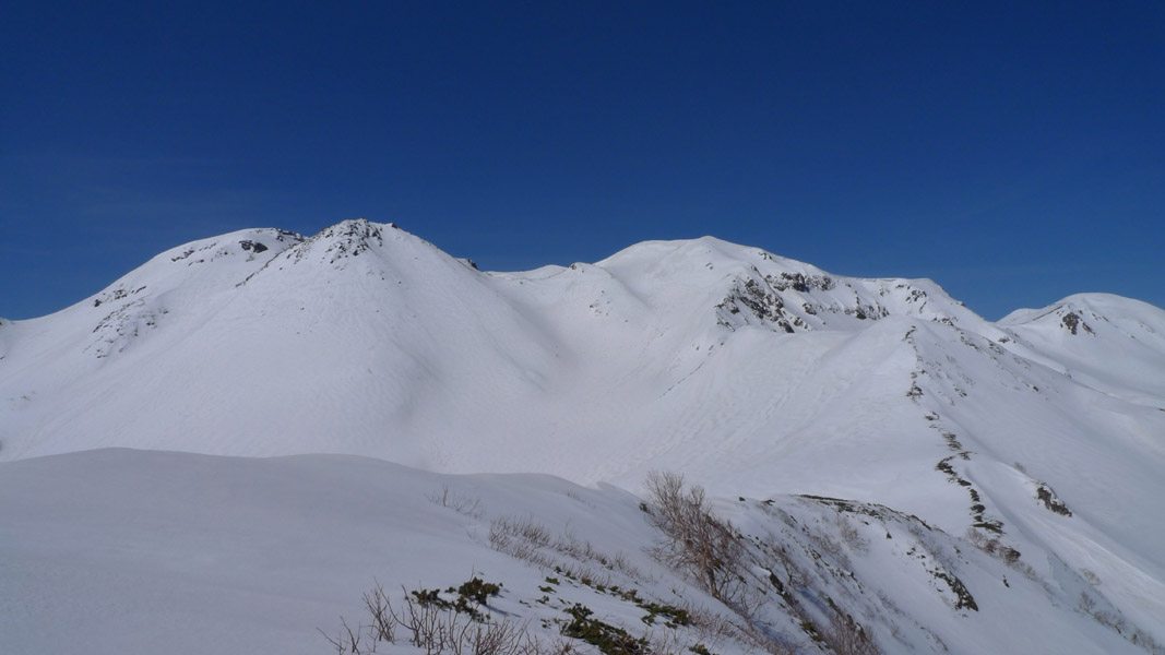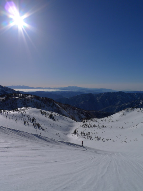 ピーカンの空の下、ぼちぼち歩き始める。スキーに適した斜面を左手に見ながら白山へ向かう。後ろを振り向けば御岳、乗鞍、劒まで立ち並んでいる。北には大笠山や笈。いい眺めですね。この日は対岸からokuちゃんたちを見守っておりましたよ。