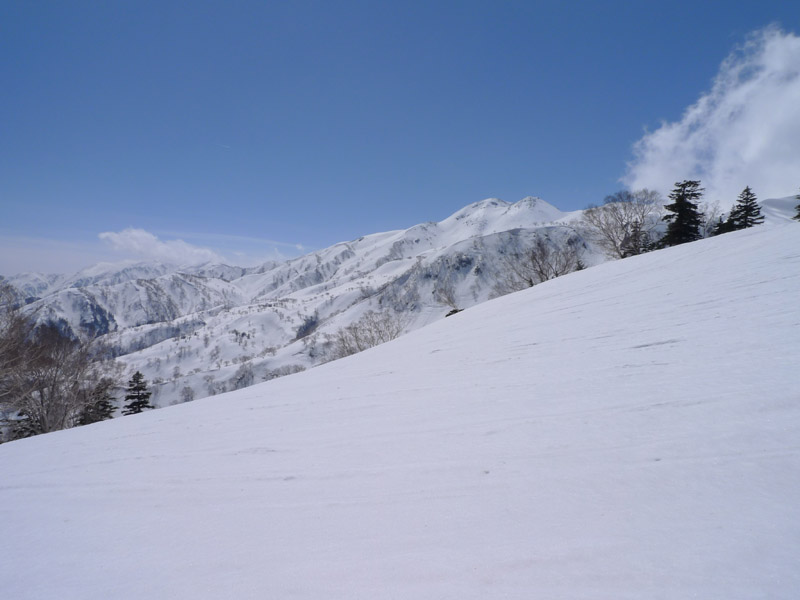 お尻で滑って降りて下さい。ここから白山東面台地。下り斜面がずっと続くのでスキーをする人にとってはとてもいい場所である。ちなみにつぼ足でスキー付いていくのは疲れます、ではなく、待ってもらわなければ置いてけぼりを食らいます。。。ハイお待たせしました。