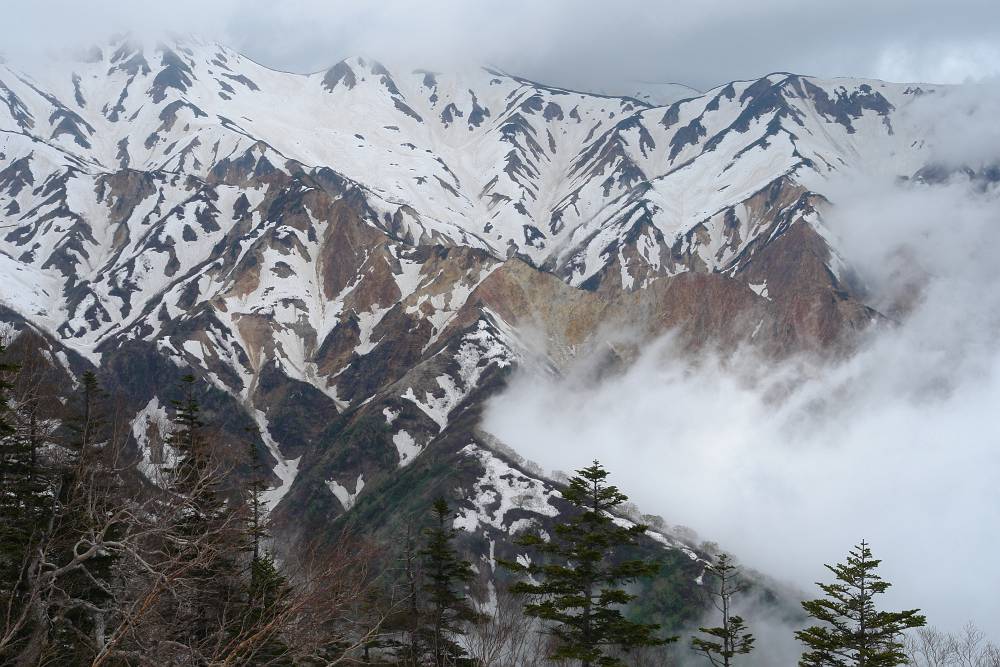 このあたりでブナの森はおしまい。あとは今日の幕営予定地まで淡々と歩くだけとなった。時間が経つに従って天気も回復する。左手には白山が姿を現す。白いですね。