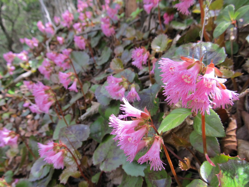 今日は観音岳には寄らず日川峠に下る、途中で尾根を間違ったのか早く降りてしまい日川峠は通らず植林地を谷に下る。地形図には岩内の瑞巌寺から日川峠を通り与原に至る破線道がのっているがその道を辿りたかったが地図を持って来なかったので適当に与原を目指す事に。日川の里も平家の落人の隠れ里と言う事で「平家隠れ洞窟」の案内板があった。植林の谷を上がって行くと明らかなかつての木馬道がスピードが出過ぎないようにカーブを描きながら尾根を上がって行く、途中で水平道になりそれはいくつかの尾根谷を巻き長く続いた、もしかしてこれが破線道かもしれないと思った。(あとで確認したら途中から破線道に合流でした)、やがて谷を下る、砂防のうえにはワサビが群生、すこしかじるとカラ~イ!、でも根っこ大きくないなぁ。