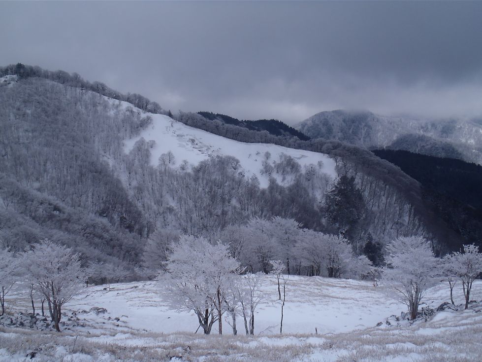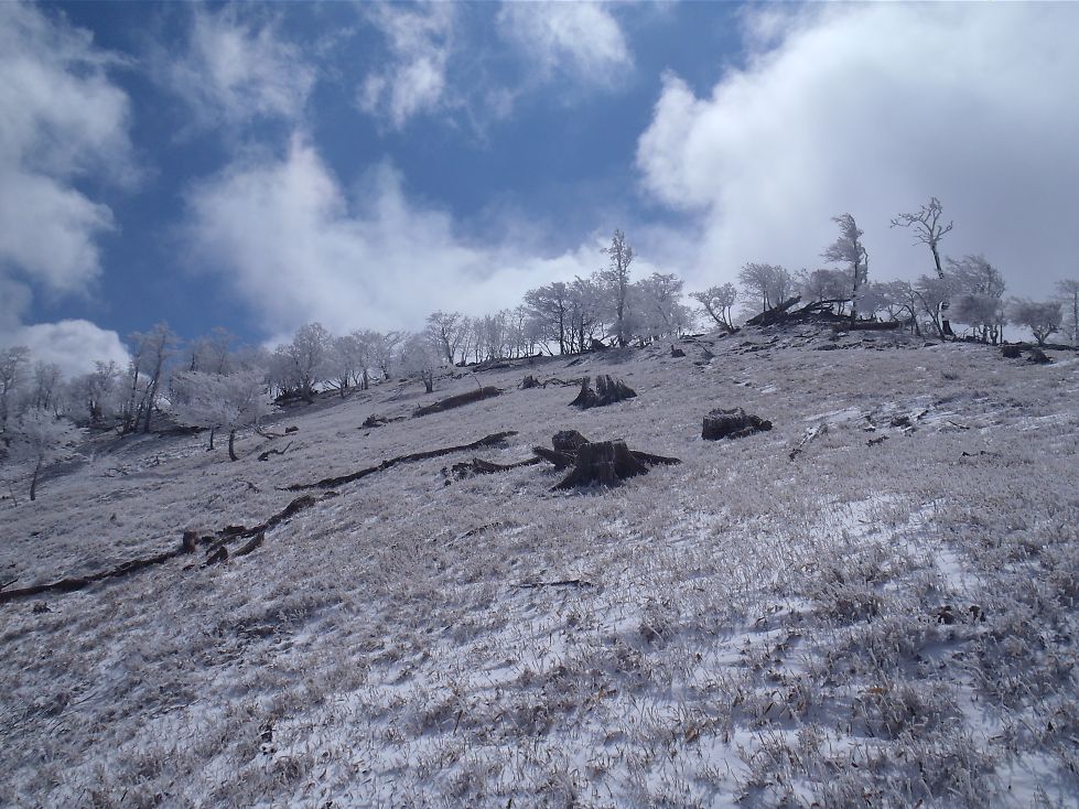 いつも通りマナコ谷道の笹原へ登る。霧氷が美しい。