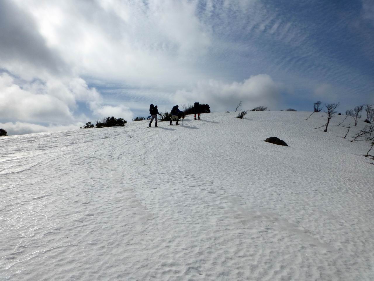 らも樹氷が見られ、雪もそこそこあってスノーシューもできた。午前中は雲が多く今ひとつはっきりしない天気であったが、午後からは青空が